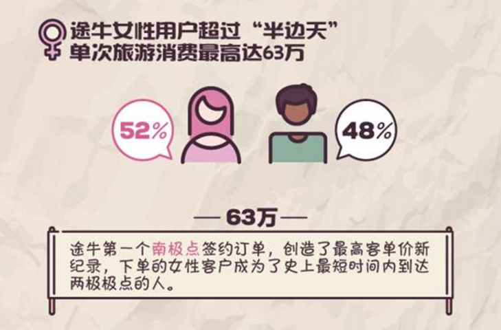 在出游数量持续上升的同时,女性用户旅游消费也很惊人。《报告》显示,过去一年,女性客户年平均出游次数超过2次,单次旅游消费最高达63万元。值得一提的是,63万元的旅游消费是途牛第一个南极点签约订单,创造了最高客单价新纪录,下单的女性客户也成为了史上最短时间内到达两极极点的人。