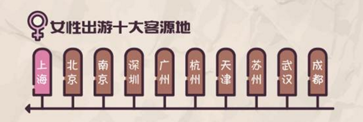 《报告》显示,女性出游的十大客源地分别为上海、北京、南京、深圳、广州、杭州、天津、苏州、武汉、成都,基本为国内经济发达城市。旅游在一定程度上是一种消费性活动,过程中的交通、住宿、餐饮等都需要相应的开支,因此,女性客户的旅游消费行为会受到收入水平的影响,呈现出一定的地域特色。