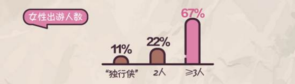 怕孤单的女性用户最爱结伴游,或者三五好友成群游玩。《报告》显示,出游人数为2人的订单占比达22%,3人及以上的订单占比67%。此外,也有11%的女性选择做“独行侠”,享受自由自在的旅游时光。