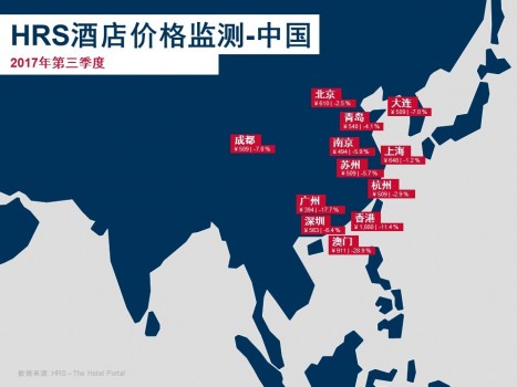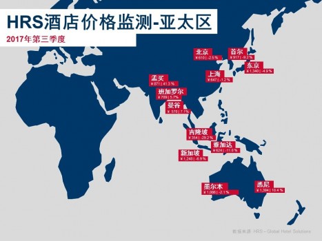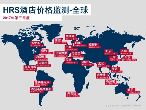 关于HRS酒店价格监测:统计范围为2017年7月1日至9月30日期间所有未取消的酒店预订,单人间和双人间,含早、未含早的1-5星级酒店均涵盖在内。被统计的城市为预订量相对较高的全球酒店预订目的地城市。