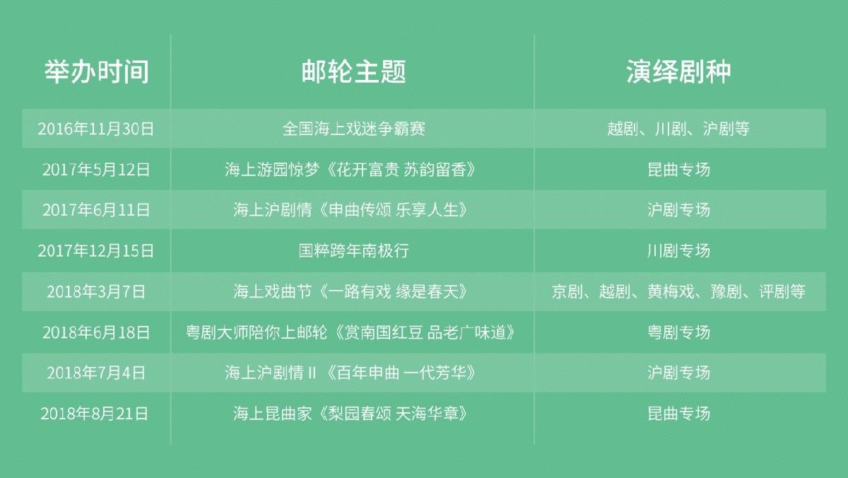 邮轮旅游源自西方,在中国发展的时间却并不长,“邮轮+戏曲”是一次文化与旅游相结合的大胆尝试。据统计,从2016年11月至今,“海上梨园”系列一共举办了8季戏曲主题航次,“京、越、黄梅、豫、评”五大剧种,以及百戏之祖昆曲、海派文化经典沪剧、广东粤剧等剧种呈现于邮轮上,更将川剧变脸艺术带至南极。