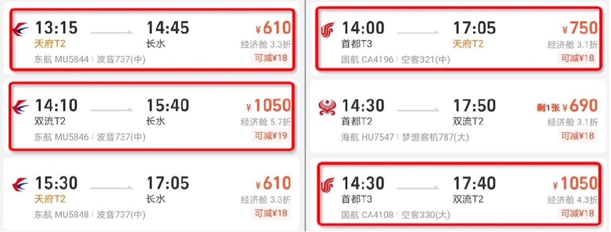 以7月6日为例,记者发现,飞猪平台东航相近时间段从成都飞昆明,天府机场起飞的航班价格比双流机场起飞的航班便宜440元;国航相近时间段从北京飞成都,落地天府机场的航班比落地双流机场的航班便宜300元。部分航线的新机场机票甚至可便宜近千元。