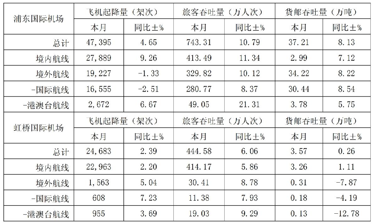 上海机场发布2026年3月运输生产情况简报。数据显示,浦东国际机场本月飞机起降量47,395架次,同比增长4.65%;旅客吞吐量743.31万人次,同比增长10.79%;货邮吞吐量37.21万吨,同比增长8.13%。