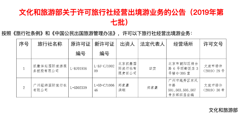 12月12日,文化和旅游部发布关于许可旅行社经营出境游业务的公告。按照《旅行社条例》和《中国公民出国旅游管理办法》,广州经纬国际旅行社有限公司、凯撒体坛国际旅游服务控股有限公司2家旅行社被许可经营出境游业务。