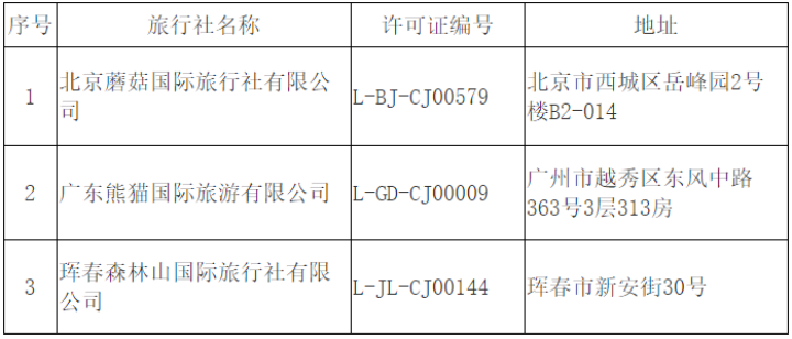 根据《旅行社条例》和《中国公民出国旅游管理办法》,自2021年10月25日起,注销以下3家旅行社业务经营许可证: