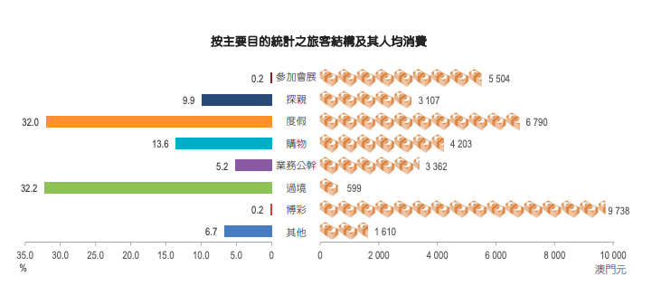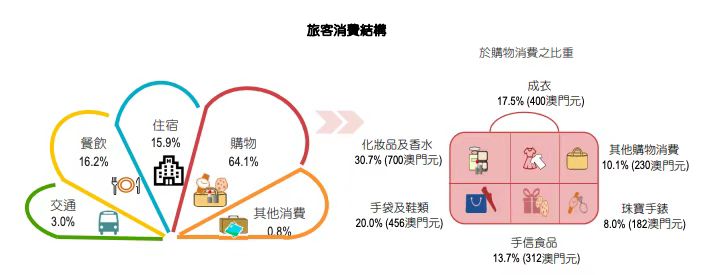 从消费层面看,澳门一季度旅客的消费主要用于购物、餐饮及住宿,其中,旅客人均购物消费同比上升2.4倍至2280澳门元,购买化妆品及香水、手袋及鞋类和成衣的支出分别同比增加2.3倍、5.6倍及4.1倍。按赴澳门主要目的统计,度假、探亲的旅客人均消费分别同比上升2倍、1.8倍。