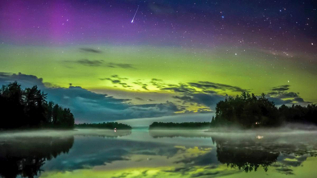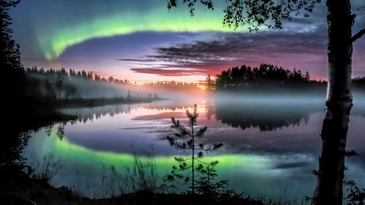 芬兰秋季湖区映射的双极光美景 ©VisitFinland