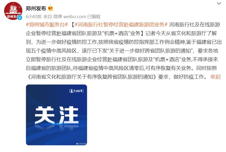 据郑州市委宣传部官方微博“郑州发布”消息,为进一步做好疫情防控工作,按照河南省疫情防控指挥部工作例会精神,鉴于福建省已出现五个疫情中高风险区,河南省文化和旅游厅厅已下发“关于进一步做好跨省团队旅游的通知”,要求各地立即暂停旅行社及在线旅游企业经营赴福建省团队旅游及“机票+酒店”业务,不得承接来自福建省的旅游团队,待福建省疫情中高风险区清零后,可有序恢复有关业务。同时按照《河南省文化和旅游厅关于有序恢复跨省团队旅游的通知》要求,做好防疫工作。