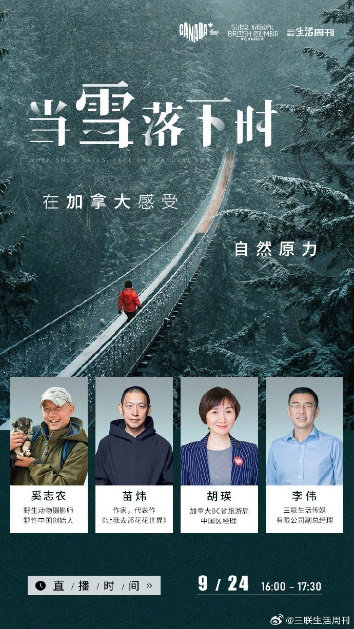 加拿大BC省一直以来因其丰富的自然和人文旅游资源备受旅行者的关注与青睐。近日,加拿大BC省旅游局联手加拿大旅游局与三联生活周刊共同发起了“当雪落下时”圆桌直播论坛,活动邀请三联生活传媒有限公司副总经理李伟、野生动物摄影师奚志农、作家苗炜、加拿大BC省旅游局中国区经理胡瑛与观众一同探讨加拿大的自然魅力。当冬季来临,你会选择怎样的生活体验?四位嘉宾在对话中激发着观众的想象,在享受冬天的过程中,思索自身与周遭世界的关系,汲取自然的力量。