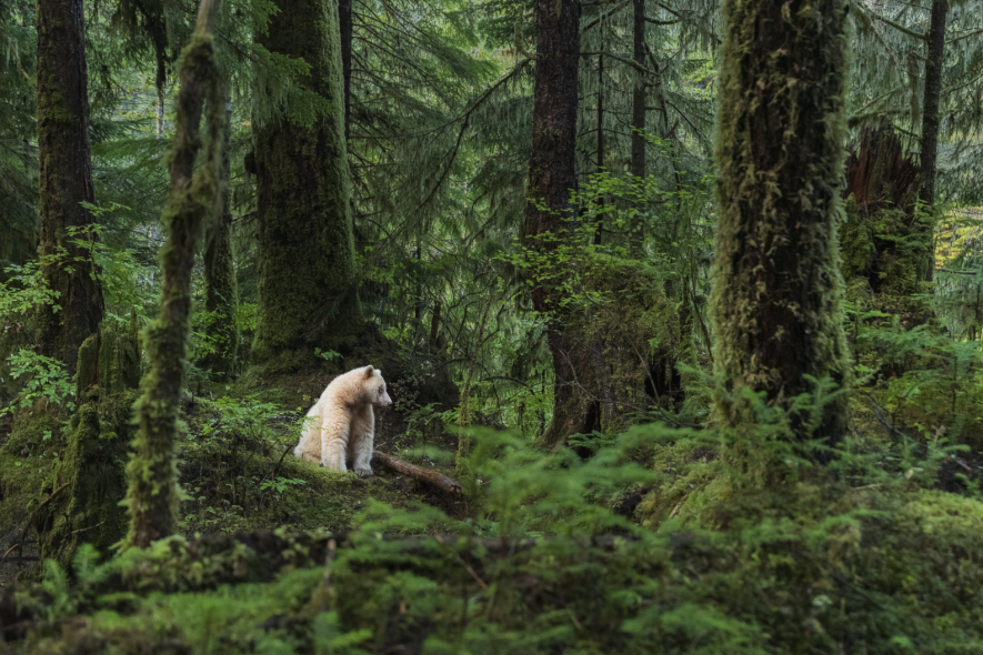 而在这片幽深的密林间,最值得驻足的,莫过于灵熊(Spirit Bear)的身影。灵熊,又称科默德熊(Kermode Bear),这是一种披着一身雪色皮毛的黑熊。那极具戏剧性的白色毛发,源于一组隐性基因的奇妙馈赠:据估算,这片区域中每十只黑熊里,便有一只会呈现这般独特模样。灵熊的故事早已融入当地原住民的古老传说,数千年来,原住民的文化传承也始终与这群生灵紧密相连。这种行踪不定的生灵,以其独特的外貌与神秘的气质,成为了大熊雨林最鲜明的象征。