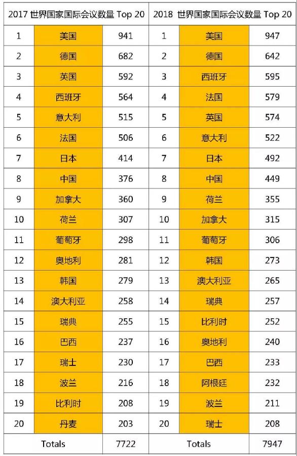 - 根据统计,2018年举办国际会议最多的前三个国家是美国、德国和西班牙,分别为947场、642场、595场,从前20名国家的分布来看,2018年新增加进来的阿根廷以232场会议列第18位,而2017年的丹麦则在2018年排在了第22位;从总体数量来看,2018年Top 20 的国家中国际会议数量总和为7947,比2017年的Top20国家的总数增加了2.91%。