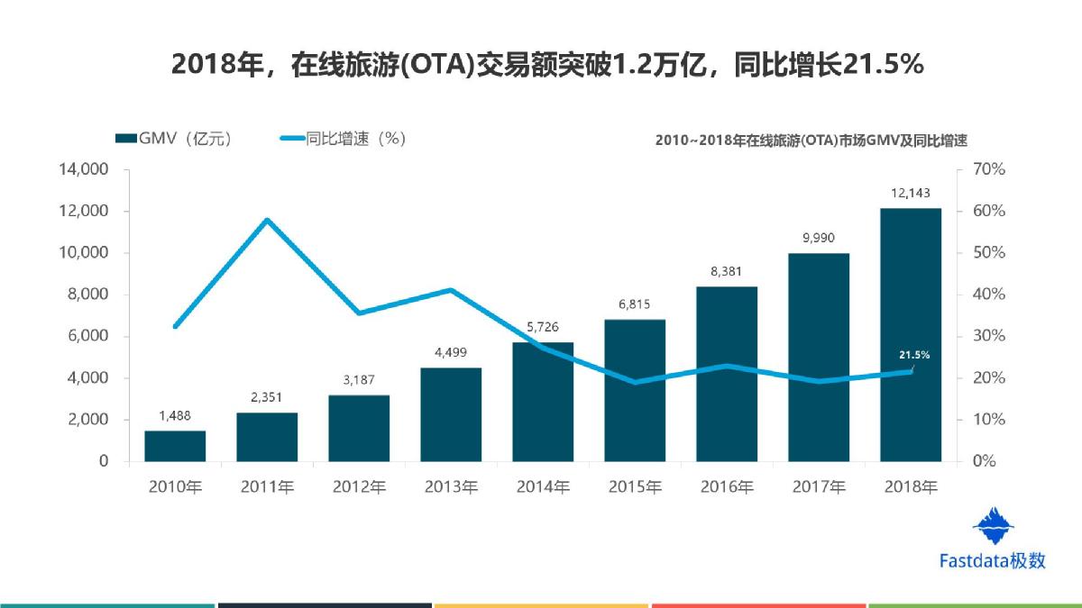 我国的在线旅游行业走过了20个年头,迈入互联网时代,背靠大数据与资本优势,OTA已经成为改变旅游行业生态的主力军。Fastdata极数发布的《2019年上半年中国在线旅游(OTA)行业分析报告》指出,2018年OTA交易额突破1.2万亿,同比增长21.5%,增速逐步趋于平稳。