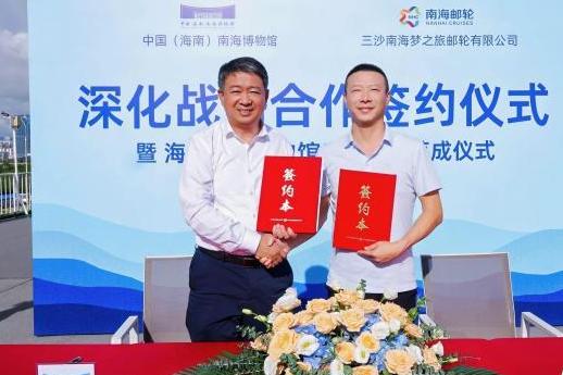 当天,中国(海南)南海博物馆与三沙南海梦之旅邮轮有限公司签订了深化战略合作协议,双方将在展览展示、文创研发、讲解及研学活动等方面展开深入合作,实现品牌增值、文化传播和游客旅行体验提升等多重目标。