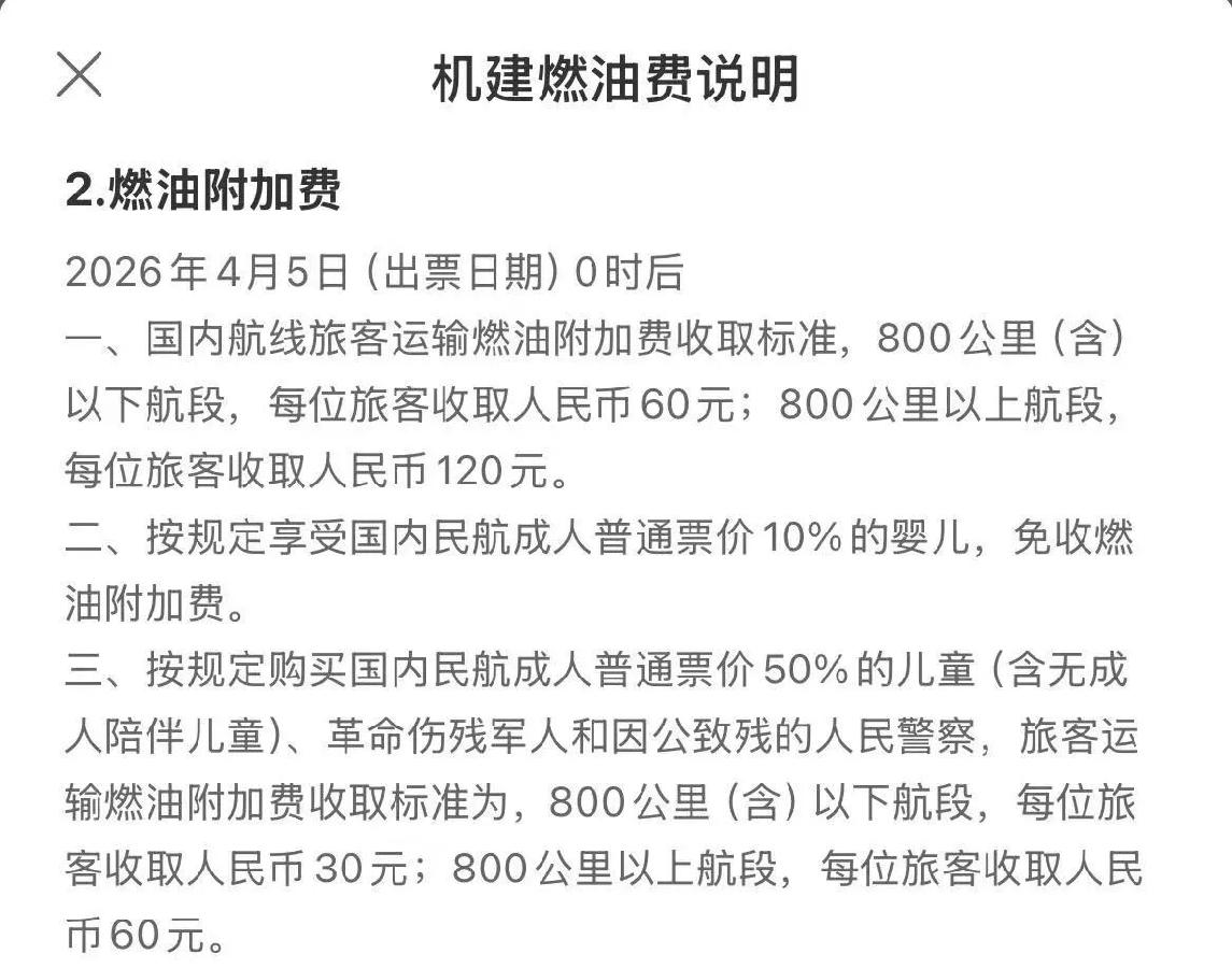 国内航线燃油附加费大幅上调,800公里(含)以下航段每位成人旅客收取60元,800公里以上航段收取120元,较调整前的10元和20元,直接上涨5倍。儿童、残疾军人等特殊群体可享受半价优惠,但也难掩整体成本的陡增。