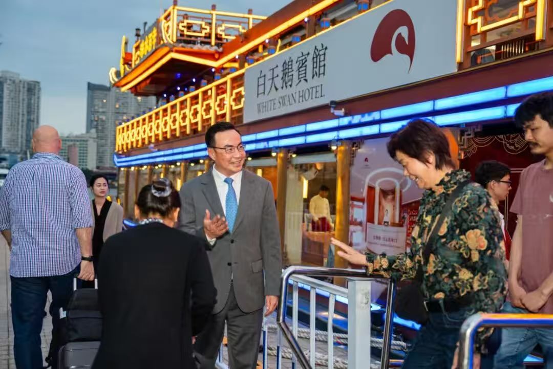 白天鹅宾馆工作人员迎接乘船归来的广交会客商